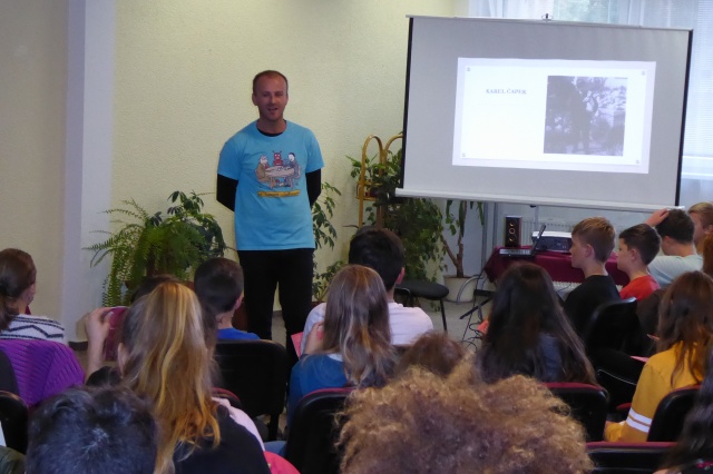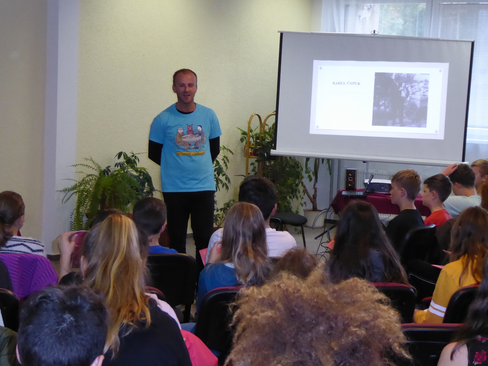 Ve středu 2. 10. jsme měli možnost vyslechnout si tři přednášky Mgr. Hasana Zahiroviće, PhD. Ačkoliv Hasan Zahirović pochází z Bosny, o Karlu Čapkovi toho ví mnohem víc než většina Čechů. Některé okamžiky ze spisovatelova života jsou mu obzvlášť blízké. Patří mezi ně hrozba války, kterou Zahirović prožil jako mladík v rodné zemi. Jeho čeština je takřka bezchybná. Rodák z Bosny a Hercegoviny přišel do Česka před třinácti lety. Během nich do detailů nastudoval Čapkův život i dílo. Na dopoledne byla vybrána přednáška s názvem „Dětství sourozenců Čapkových + Dášeňka“, která byla určena žákům prvního stupně ZŠ. Druhá přednáška na téma „ Zákulisí tvorby a inscenační praxe dramatických děl Karla Čapka, která byla doplněna tématem „ K. Čapek očima cizince“ byla určena žákům sedmých až devátých tříd ZŠ. Jiný pohled na díla Karla Čapka žáky nadchl a dokázali se soustředit po celou dobu přednášky.